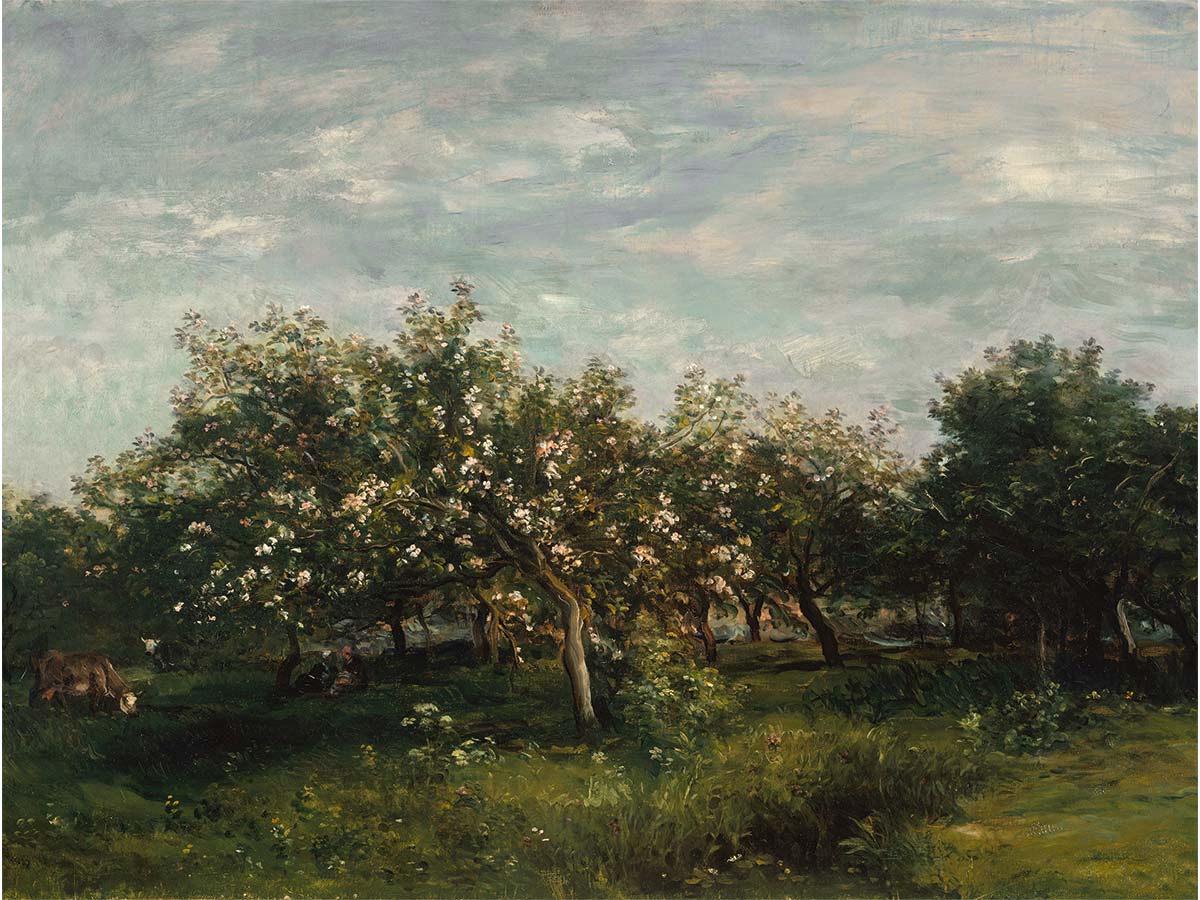 Antique Spring Landscape Print, Apple Tree Blossom Oil Painting, Vintage Countryside Wall Art, Rustic Farmhouse Décor, Orchard