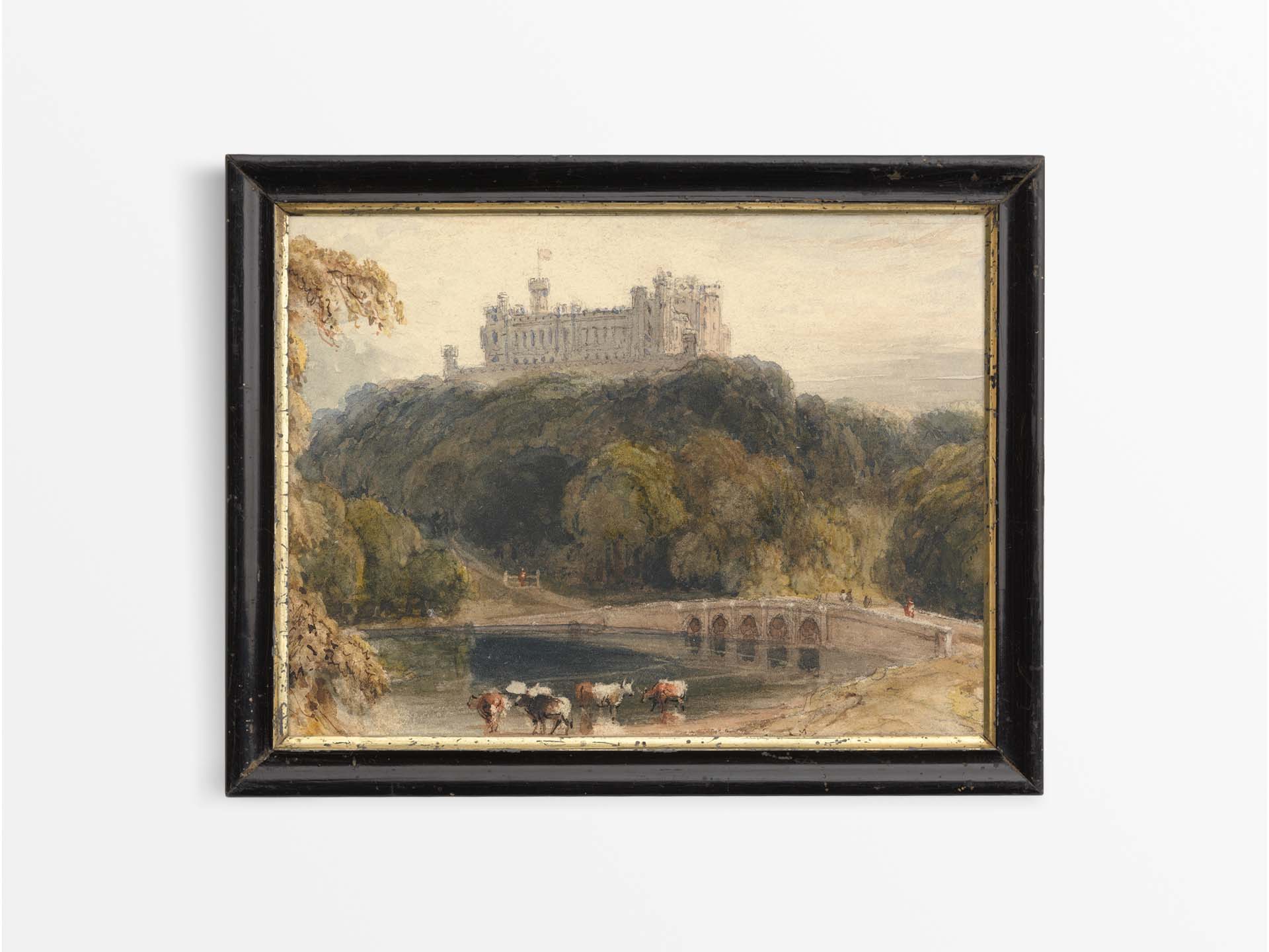 Neutral Antique Landscape Watercolour Painting, Vintage Wall Art Print, Rustic Country Farmhouse Décor, Countryside Trees, Bridge, Castle, Grantham Leicestershire