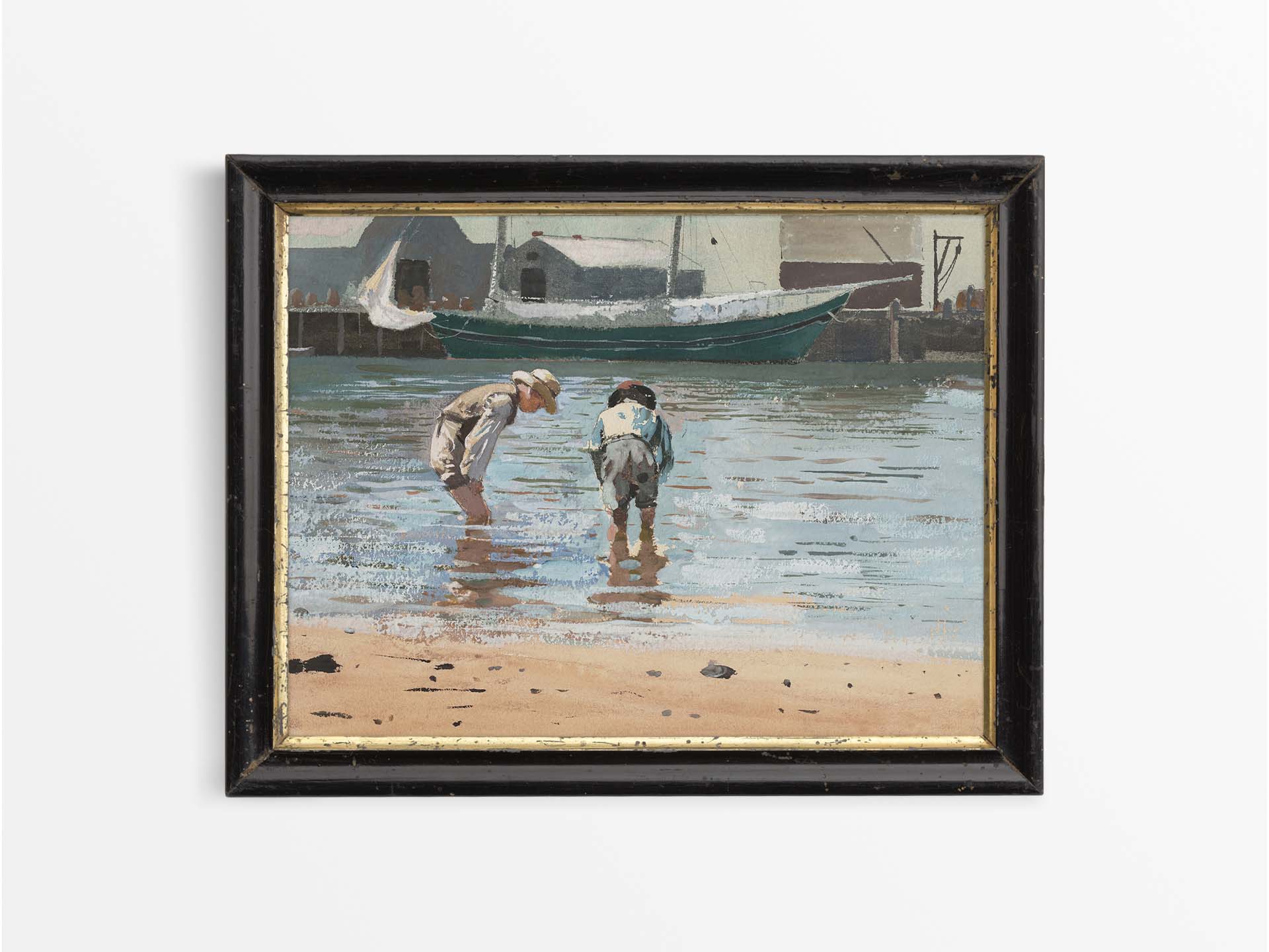 Children Paddling, Nautical Coastal Sailboat Watercolour Painting, Neutral Vintage Ocean Art Print, Sea Lake House Wall Décor
