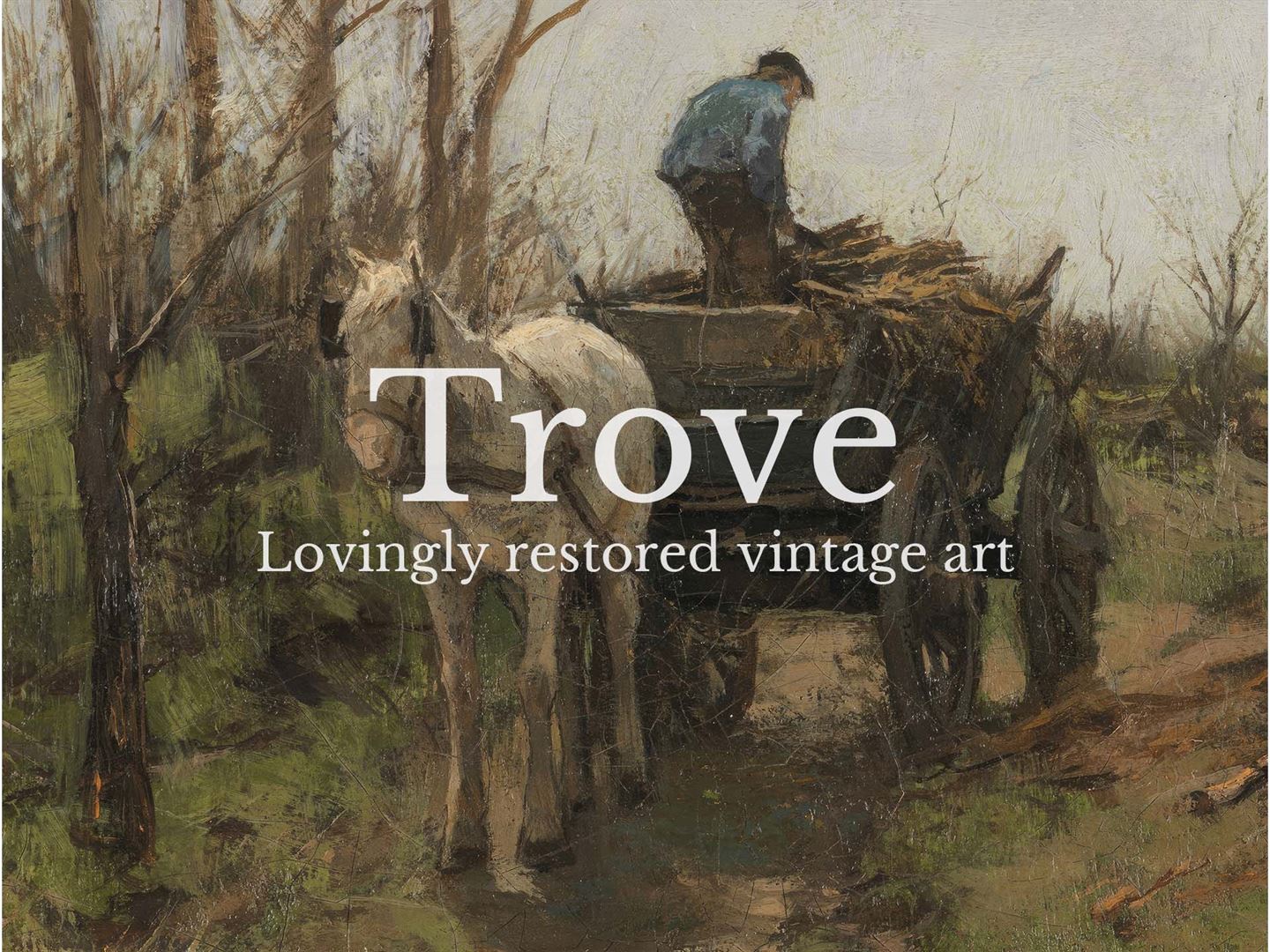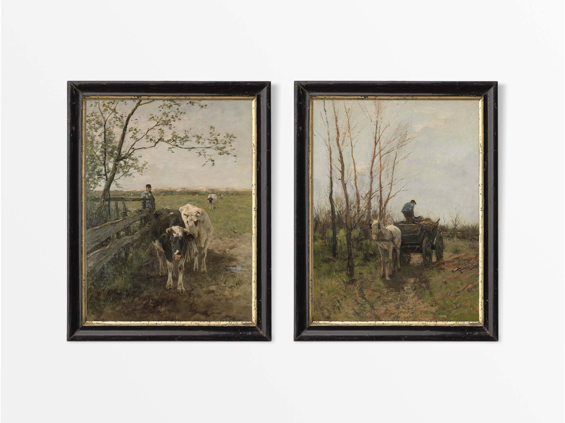 Set of Two Rustic Antique Oil Paintings, Neutral Vintage Landscape Wall Art Prints, Moody Countryside Farmhouse Décor, Country, Horse and Cart, Trees, Cows