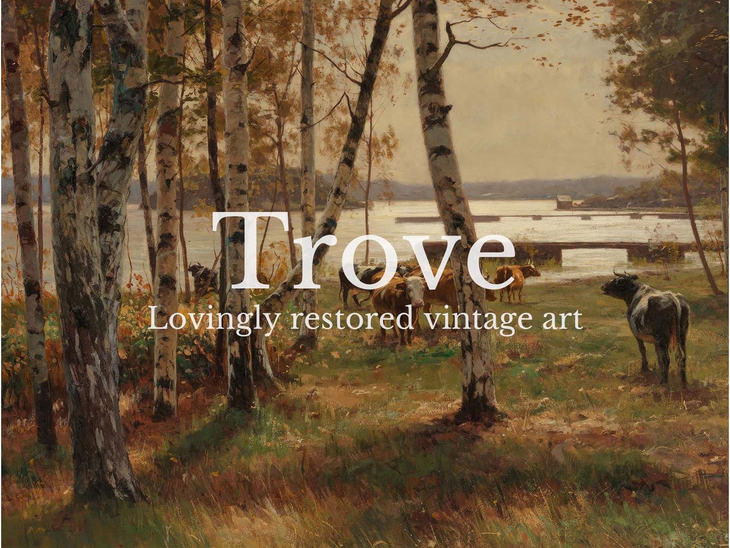 Moody Antique Autumn Landscape Oil Painting, Rustic Vintage Cows Wall Art Print, Fall Countryside Farmhouse Décor, Lake, Birch Trees