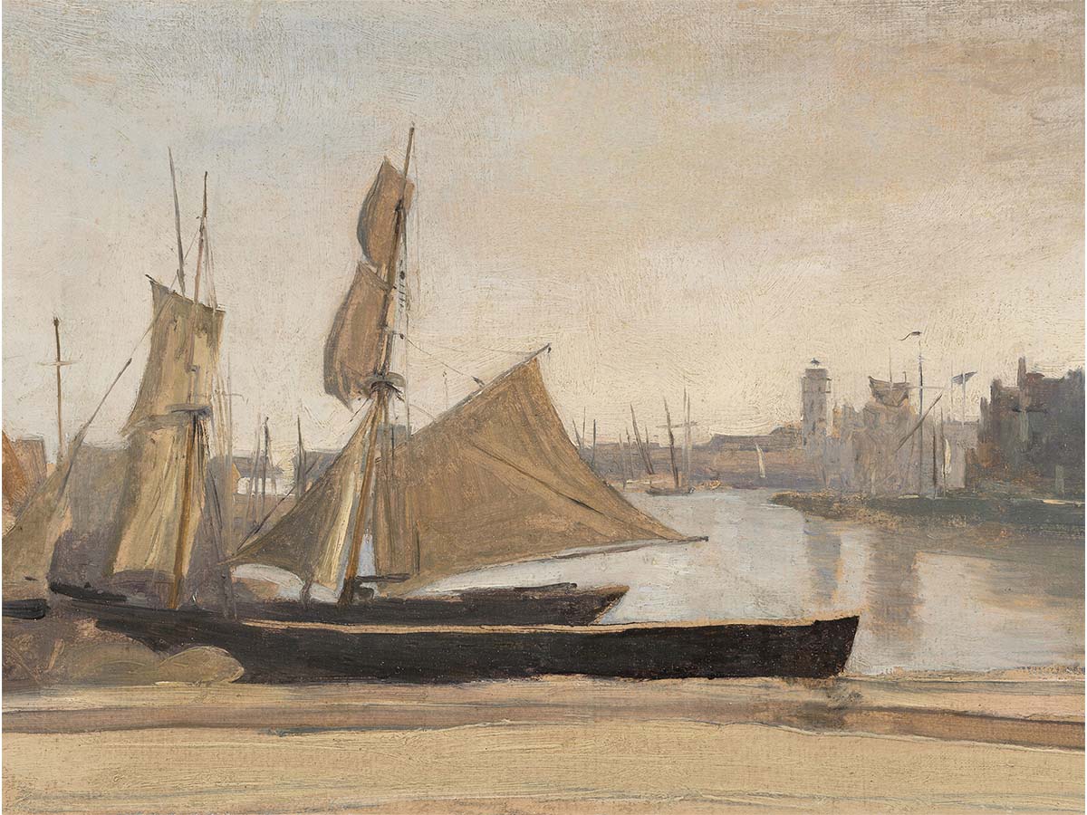 Vintage European Coastal Oil Painting, Neutral Ocean Beach House Décor, Minimalist Antique Wall Art Print, Sea Harbour Sailboat Fishing Boat