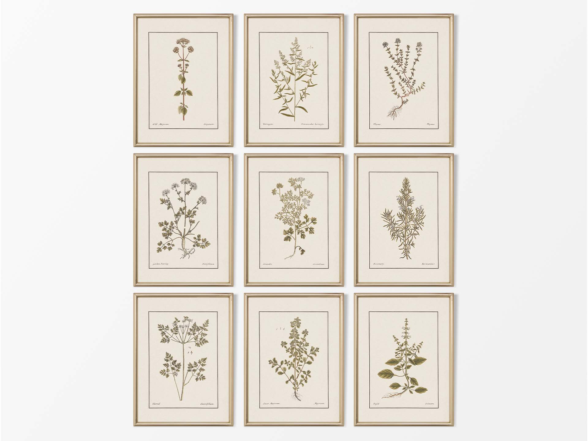 Set of Nine Herb Wall Art Prints, Antique Botanical Drawings, Vintage Still Life Paintings, Floral Country Farmhouse Kitchen Décor, Oregano, Basil, Rosemary, Parsley, Coriander, Thyme, Marjoram, Tarragon, Chervil