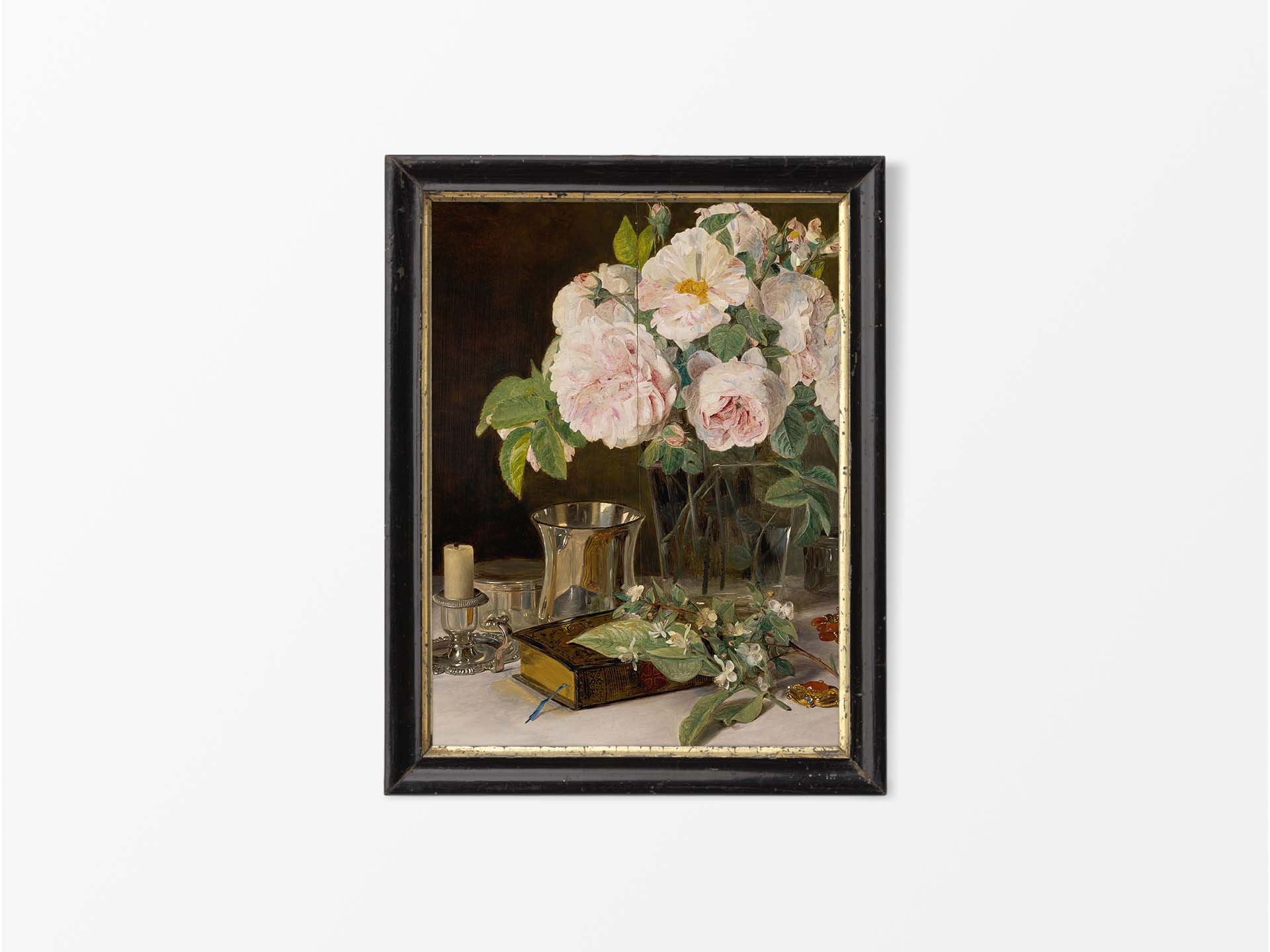 Set of Two Moody Vintage Roses Still Life Oil Paintings, Rustic Antique Flower Vase Wall Art Prints, Floral Country Farmhouse Décor