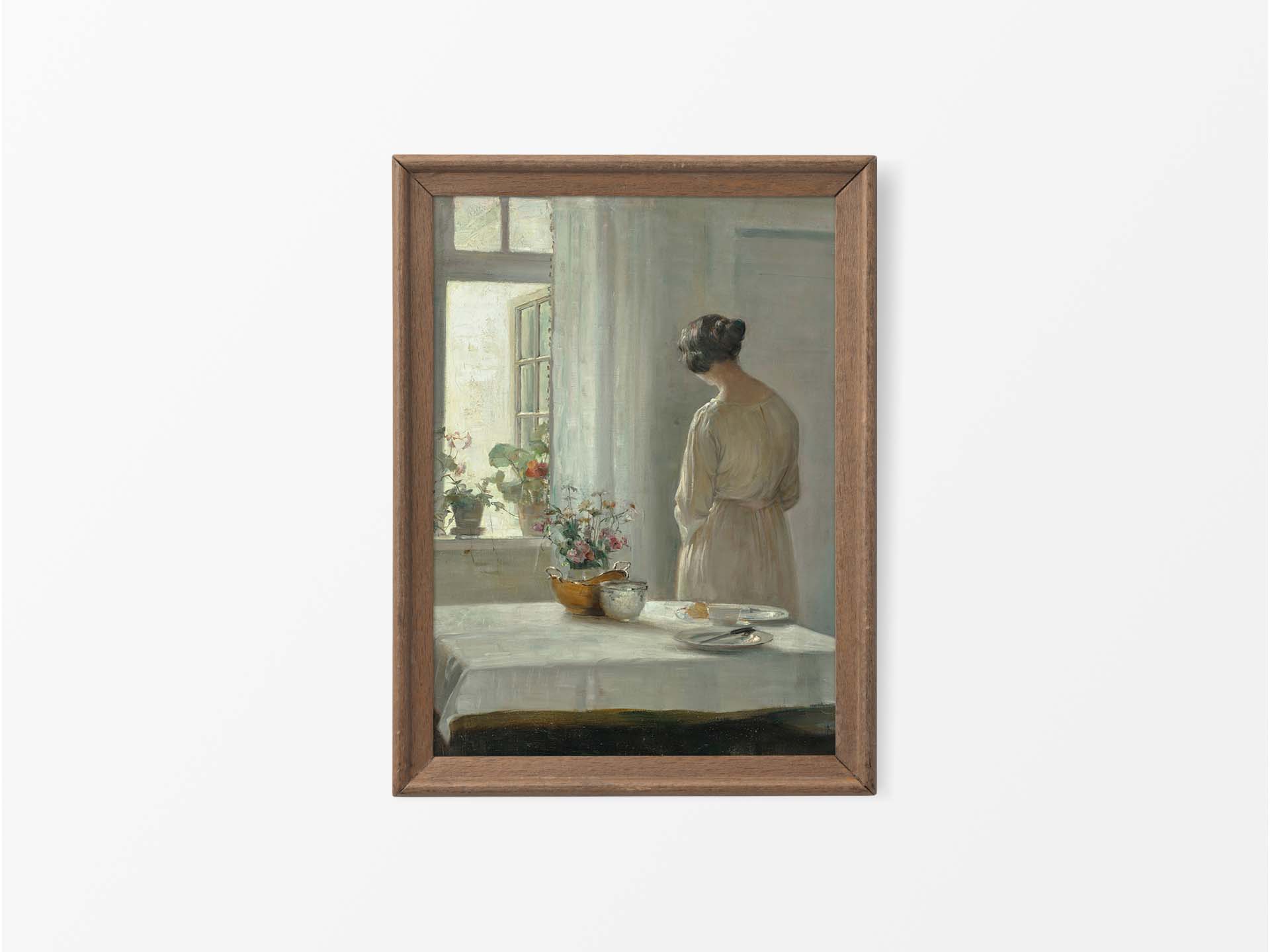 Rustic Antique Woman Portrait Wall Art Print, Neutral Vintage Oil Painting Artwork, White Dress, Kitchen, Dining Room, Window