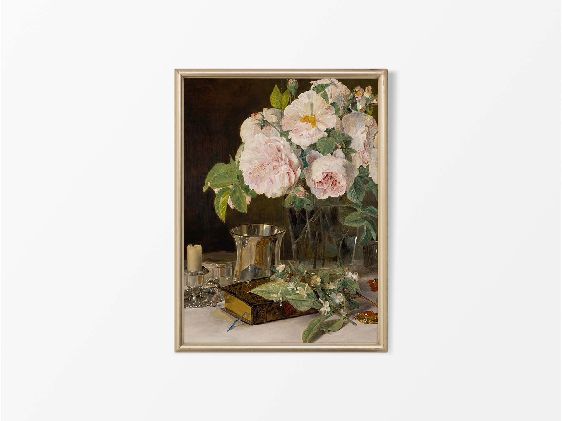 Moody Vintage Roses Still Life Oil Painting, Rustic Antique Flower Vase Wall Art Print, Floral Country Farmhouse Décor
